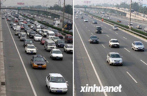 左圖和右圖分別為8月16日8時許和17日8時許在北京東四環(huán)小武基橋拍攝的車流。