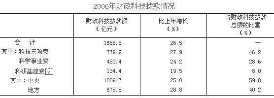 2006年,國(guó)家財(cái)政科技撥款額為1688.5億元,比上年增加353.6億元,增長(zhǎng)26.5%;科技撥款占當(dāng)年國(guó)家財(cái)政支出的比重為4.2%,為1998年以來的最高水平。在國(guó)家財(cái)政科技撥款中,中央財(cái)政科技撥款為1009.7億元,比上年增長(zhǎng)25%,占中央財(cái)政支出的比例為10.3%;地方財(cái)政科技撥款為678.8億元,比上年增長(zhǎng)28.8%,占地方財(cái)政支出的比重為2.2%,比上年略有提高。