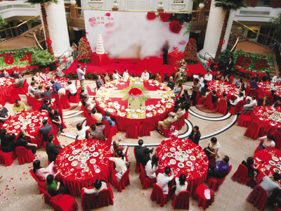 “我們餐廳國慶節(jié)期間1號到7號的婚宴一個月前就被搶訂一空,有時同一天樓上樓下甚至有兩對新人一起擺婚宴”,北京大鴨梨餐廳的劉經理一邊指揮服務員布置婚宴現場一邊告訴《市場報》記者,“這兩年是青年人結婚的高峰年,‘十一’的天氣又比較適宜,所以出現了婚宴扎堆的現象,一些預訂稍遲的人甚至為找不到舉辦婚宴的合適餐廳而苦惱! 記者又走訪了幾家大型餐飲、酒店企業(yè),情況大體相同。溫特萊酒店的前廳經理黃小姐國慶節(jié)這幾天忙得不亦樂乎,她告訴記者,酒店的婚宴早就預訂一空。 記者注意到,由于現在的婚宴每桌標準大都在400元以上,并且一開就是十幾、二十桌,粗略算來國慶節(jié)7天長假各家餐飲企業(yè)都賺了個盆滿缽滿。為了體現餐廳的專業(yè)程度,黃金周期間許多餐廳甚至停止了對散客營業(yè),以求專心致志地搞好婚宴的服務。