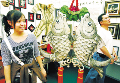 第二屆中國民間藝人節(jié)日前在杭州清河坊歷史街區(qū)吳山文化廣場舉行,來自全國的150位民間工藝大師帶來千余件作品。圖為來自黑龍江省的魚皮貼畫“吉慶”掛件。