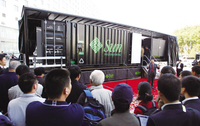 10月22日,全球第一個移動式、虛擬化的數(shù)據(jù)中心——Sun Blackbox,經(jīng)過美國、加拿大、英國、俄羅斯和新加坡巡游后,來到北京。圖為北京市電信、金融、能源、教育等行業(yè)的眾多人士爭睹這個以標(biāo)準(zhǔn)集裝箱構(gòu)建、可靈活移動又經(jīng)濟(jì)環(huán)保的模塊虛擬化數(shù)據(jù)中心。