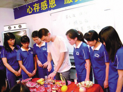 會做西餐,能講外語,深圳涉外管家培訓(xùn)班的“洋保姆”們在上調(diào)酒課。 | 隨著中國經(jīng)濟(jì)的迅速發(fā)展,漢語受到許多國家的重視。加上遍布世界的華人家庭的需要,高素質(zhì)的中國保姆開始走俏。受過專業(yè)培訓(xùn)的涉外保姆走向海外,在家政業(yè)大展拳腳。