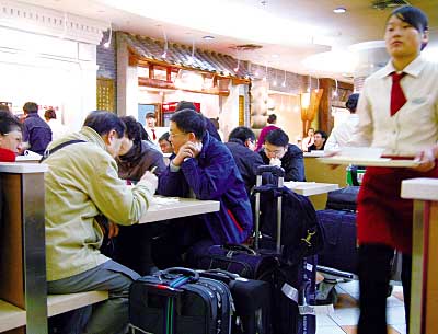 近日,首都機場航站樓內(nèi)部分餐飲店開始降價,單品最高降價達33%。預(yù)計到11月30日,共248種食品將和市內(nèi)同質(zhì)同價。圖為機場航站樓地下一層中華美食城餐廳一角。