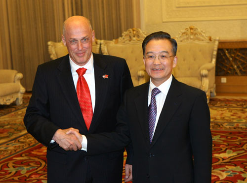 國務(wù)院總理溫家寶13日在人民大會堂會見了出席第三次中美戰(zhàn)略經(jīng)濟對話的美國總統(tǒng)布什的特別代表、財政部長保爾森等美方代表團主要成員。