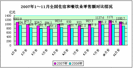 今年11月份,全國(guó)住宿與餐飲業(yè)零售額實(shí)現(xiàn)1100.7億元,比去年同期增長(zhǎng)21.6%,增幅高出3.9個(gè)百分點(diǎn),比上月增幅高出0.2個(gè)百分點(diǎn),再創(chuàng)今年新高。今年1-11月份,全國(guó)住宿與餐飲業(yè)零售額累計(jì)實(shí)現(xiàn)11131.3億元,同比增長(zhǎng)18.9%,比去年同期增幅高出2.7個(gè)百分點(diǎn),占社會(huì)消費(fèi)品零售總額的13.9%,拉動(dòng)社會(huì)消費(fèi)品零售總額增長(zhǎng)2.6個(gè)百分點(diǎn),對(duì)社會(huì)消費(fèi)品零售總額的增長(zhǎng)貢獻(xiàn)率為15.7%。 1-11月份,住宿與餐飲業(yè)新設(shè)立外商投資企業(yè)862家,同比下降11.9%;合同外資金額32.6億美元,同比增長(zhǎng)29.6%;實(shí)際使用外資金額7.9億美元,同比增長(zhǎng)8.3%。 從限額分類看,1-11月份,限額以上住宿與餐飲企業(yè)零售額3294.1億元,同比增長(zhǎng)18.8%,占全國(guó)住宿與餐飲業(yè)零售額的29.6%。限額以下住宿與餐飲企業(yè)零售額7837.2億元,同比增長(zhǎng)18.9%,占全國(guó)住宿與餐飲業(yè)零售額的70.4%。