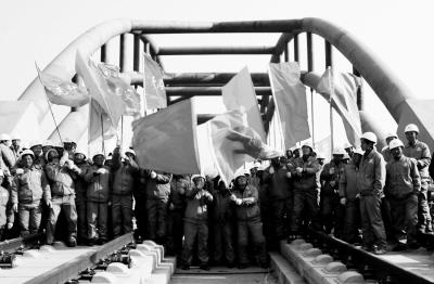 12月16日京津城際鐵路全線鋪通,筑路工人在開路立交橋橋頭歡呼勝利。 | 12月8日,