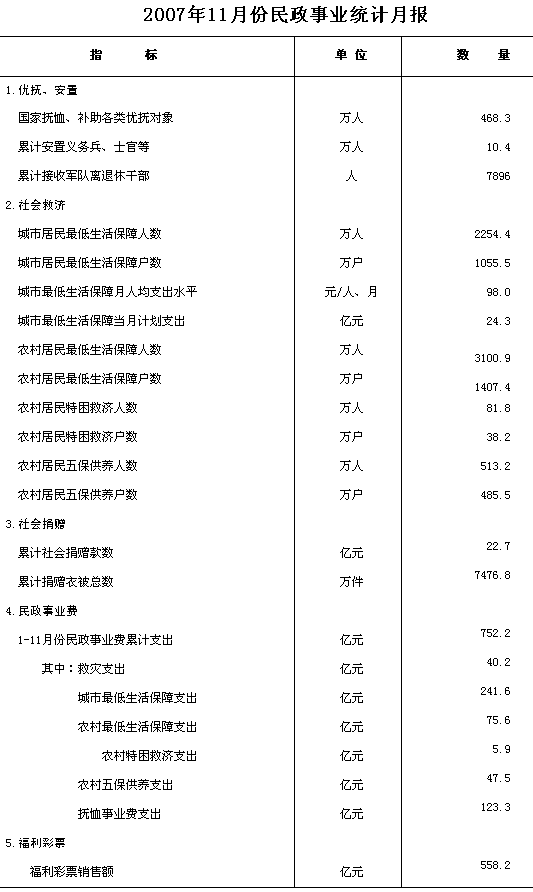 日前,民政部于其網(wǎng)站上公布了2007年11月份民政事業(yè)統(tǒng)計(jì)數(shù)據(jù),詳情如下。
