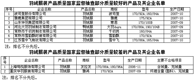 抽查結(jié)果表明,一是連續(xù)的國家監(jiān)督抽查促進了企業(yè)質(zhì)量意識的提高,加強了質(zhì)量管理,被抽查的羽絨服裝的衛(wèi)生指標(biāo)嗜溫性需氧菌、糞鏈球菌、亞硫酸還原的梭狀芽孢桿菌、沙門氏菌、甲醛含量、pH值全部符合國家相關(guān)標(biāo)準(zhǔn)規(guī)定的要求;二是此次抽查了12家國家免檢產(chǎn)品和10家中國名牌產(chǎn)品,所檢項目全部合格。三是市場占有率較高的大型生產(chǎn)企業(yè)產(chǎn)品質(zhì)量較好,產(chǎn)品實物質(zhì)量合格率為100%。