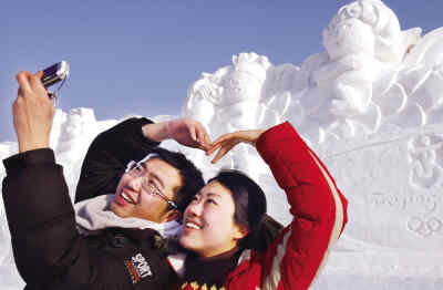 昨日(8日),2008中國沈陽國際冰雪節(jié)大型雪雕《雅典―北京》、《龍騰奧運》等亮相沈陽棋盤山冰雪大世界。本屆冰雪節(jié)將于1月11日開幕。圖為游客在大型雪雕《龍騰奧運》前合影留念。 新華社 發(fā)