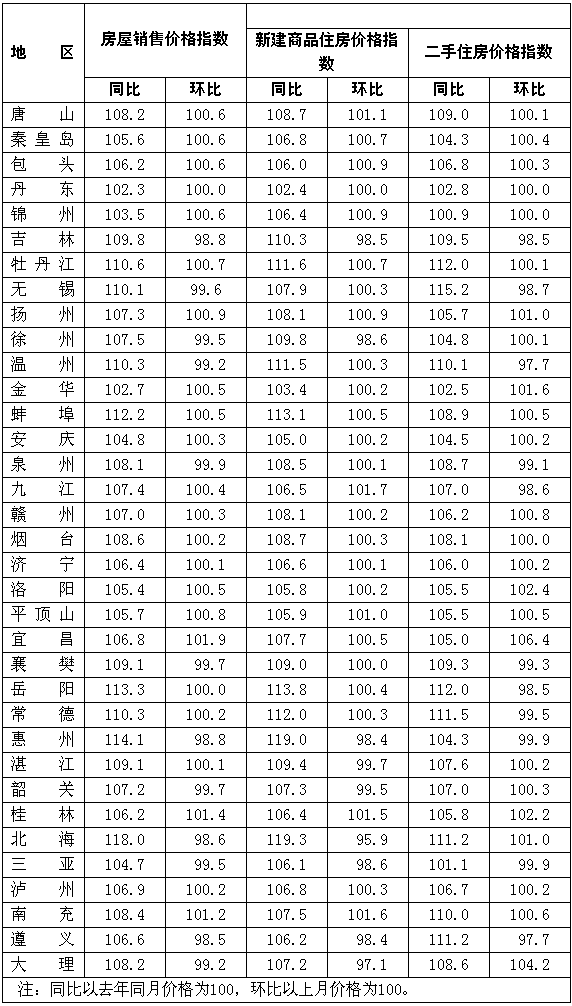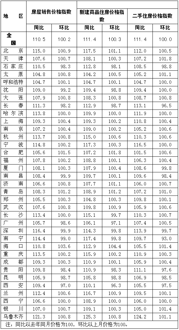 一、新建商品住房銷售價(jià)格同比上漲11.4%,漲幅比上月低0.8個(gè)百分點(diǎn);環(huán)比上漲0.3%,漲幅比上月低0.7個(gè)百分點(diǎn)。分類別看,經(jīng)濟(jì)適用房、普通住房和高檔住房銷售價(jià)格同比分別上漲3.9%、12.1%和11.8%,環(huán)比分別上漲0.0%、0.3%和0.2%。分地區(qū)看,同比漲幅較高的主要城市包括:烏魯木齊25.3%、北海19.3%、惠州19.0%、北京17.5%、南寧17.4%、寧波17.3%、蘭州16.7%、重慶15.9%和長(zhǎng)沙15.1%等;環(huán)比漲幅較高的主要城市包括:海口