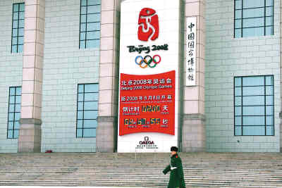 中國(guó)國(guó)家博物館門前的2008年奧運(yùn)會(huì)倒計(jì)時(shí)牌顯示距北京奧運(yùn)會(huì)開(kāi)幕還有200天。 新華社記者 高學(xué)余