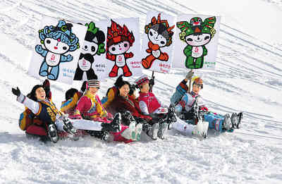 1月21日,濟(jì)南九頂塔民族風(fēng)情園滑雪場(chǎng)舉行喜迎奧運(yùn)活動(dòng)。圖為游客手舉“福娃”圖案滑雪。 呂傳泉