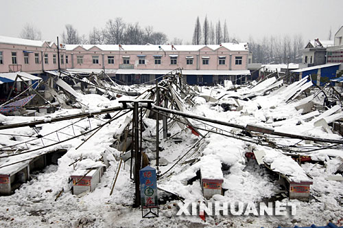 這是因大雪整體坍塌的安徽省舒城縣城關(guān)鎮(zhèn)孔集農(nóng)貿(mào)市場(1月22日攝)。 |