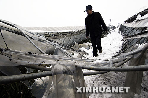 1月22日,安徽省舒城縣雙豐農(nóng)業(yè)科技示范園的一名工人在查看被大雪壓塌的大棚。 | |