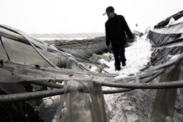 1月22日,安徽省舒城縣雙豐農(nóng)業(yè)科技示范園的工人在整理被大雪壓塌的大棚。連日來,安徽部分地區(qū)持續(xù)降雪。大雪造成全省12個市受災(zāi),受災(zāi)人口300多萬人,轉(zhuǎn)移安置4000多人,因?yàn)?zāi)死亡1人,因?yàn)?zāi)傷病14人。農(nóng)作物受災(zāi)面積200多萬畝,倒塌房屋3600多間,直接經(jīng)濟(jì)損失4.3億元。新華社記者:李健 攝