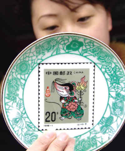 郵票瓷盤是經(jīng)我國(guó)郵政部門批準(zhǔn),為紀(jì)念或慶祝與集郵有關(guān)的活動(dòng)而設(shè)計(jì)制作的以郵票為主圖的藝術(shù)瓷盤。圖為江西省景德鎮(zhèn)集郵公司營(yíng)業(yè)員日前展示的生肖鼠郵票瓷盤。