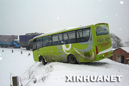 1月27日,一輛載客大客車由江蘇駛往安徽廬江,繞道行至巢湖市無為縣裕新路一彎道時,因路面積雪濕滑,車輛失控險些栽進裕溪河,聞訊趕到的交警立即組織施救并將乘客安全轉(zhuǎn)運。1月26日,安徽省巢湖市出現(xiàn)暴雪天氣,給人們出行帶來很大不便,道路交通受到影響。巢湖市氣象臺發(fā)布了暴雪和道路結(jié)冰橙色預(yù)警。 新華社發(fā)