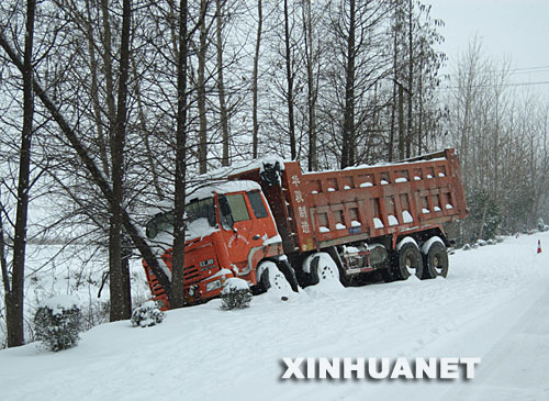 1月26日,一輛大貨車在合巢路巢湖廟集收費站附近因路滑失控栽到路邊。新華社發(fā)