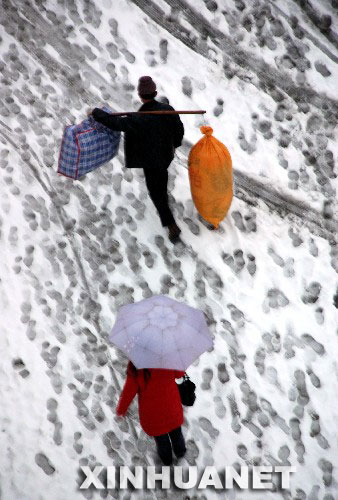 1月20日,兩位行人在合肥市積雪的道路上謹慎前行。 當(dāng)日9時20分,合肥市氣象臺繼續(xù)發(fā)布暴雪黃色預(yù)警信號。連日來,合肥地區(qū)普降大雪,氣象部門連續(xù)發(fā)布暴雪警報。目前降雪仍在持續(xù),給市民出行帶來不便。 新華社發(fā)
