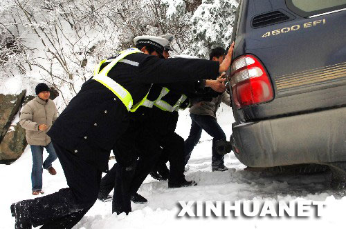 1月24日,安徽省岳西縣幾位民警在推陷入積雪的汽車。近日,位于大別山區(qū)的安徽省岳西縣出現(xiàn)有歷史記錄以來最大降雪,造成全縣道路中斷。大雪過后,該縣縣直機關(guān)、各鄉(xiāng)鎮(zhèn)、村積極行動起來,開展除雪工作,盡全力保證道路暢通。 新華社記者 李健 攝