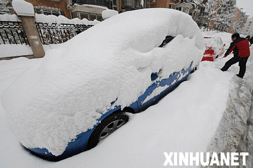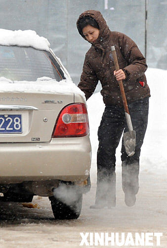 1月28日,一位南京市民在清除汽車周圍的積雪。
