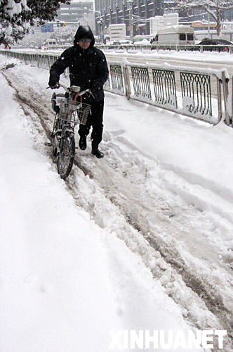 1月28日,南京市民冒雪行進。