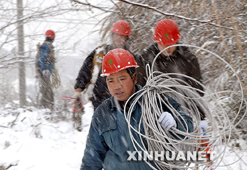 | 1月28日,宣城供電公司水東供電所員工冒著大雪搶修線路。 新華社發(fā)(李曉紅