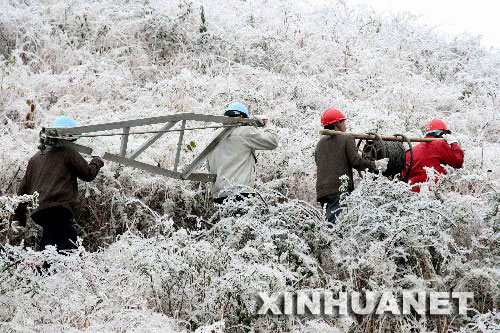 | 1月22日,凱里市供電部門職工趕往事故現(xiàn)場搶修供電設(shè)施。受大面積冰凍災(zāi)害天氣影響,貴州電網(wǎng)多處線路受損,黔東南苗族侗族自治州和銅仁地區(qū)有9個縣停止供電。凱里電網(wǎng)2000多名職工投入“抗冰保電”一線晝夜搶修。