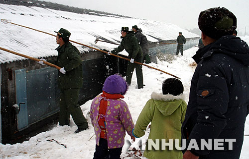 | 1月28日,在安徽省宣城市楊柳鎮(zhèn)華山村,武警官兵幫助村民清除積雪。當(dāng)日,安徽省宣城市普降暴雪,宣城市楊柳鎮(zhèn)華山村一養(yǎng)殖戶飼養(yǎng)的2萬只雞被困在房屋里,武警宣城支隊官兵聞訊趕往現(xiàn)場,幫助當(dāng)?shù)厝罕娗謇矸e雪、搶救財產(chǎn)。新華社發(fā)(廖福安