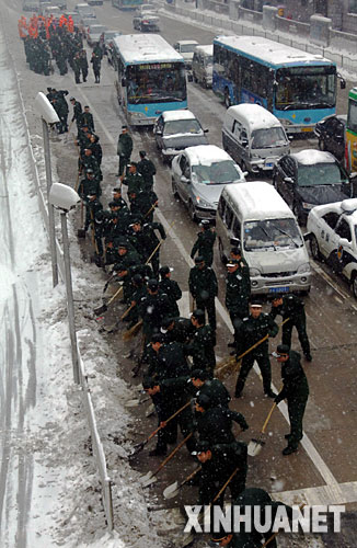 | 1月27日,武警安徽總隊合肥支隊的官兵在街道上除雪。當(dāng)日,合肥再次降大到暴雪,造成市內(nèi)道路積雪嚴(yán)重,交通受阻。為保障道路暢通和市民出行安全,合肥市各部門積極行動,武警安徽總隊合肥支隊也派出上千名官兵,同心同力,抗擊雪災(zāi)。
