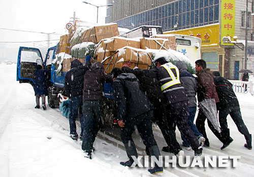 | 1月27日,市民和交警一起幫助推一輛拋錨的貨車。當(dāng)日,安徽省蕪湖市出現(xiàn)暴雪天氣,當(dāng)?shù)仄囌究瓦\全線停運。蕪(湖)馬(鞍山)、蕪(湖)宣(城)高速公路全部封閉,安徽氣象部門同時發(fā)布暴雪橙色預(yù)警和道路結(jié)冰黃色預(yù)警。新華社發(fā) |