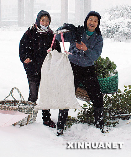 | 1月28日,菜農(nóng)冒雪送菜到菜市。從1月26日起,安徽省蕪湖市連降大雪,道路交通受阻,菜市蔬菜供應(yīng)緊缺。不少菜農(nóng)冒雪送菜。新華社發(fā)(陳立希