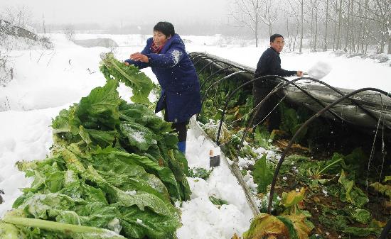 1月30日,居巢區(qū)望城村村民從受損的大棚內(nèi)搶收蔬菜。