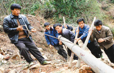 面對(duì)因冰雪災(zāi)害造成的斷電,廣西融水縣群眾積極支援電力工人,和他們一道奮戰(zhàn)在搶修一線(xiàn),為恢復(fù)生產(chǎn)、重建家園出力。圖為2月13日,在融水縣拱洞鄉(xiāng)古也村,村民們合力拉電桿準(zhǔn)備豎起。
