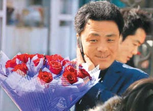 一位男士手持玫瑰行走在遼寧大連街道上。王錫增/攝