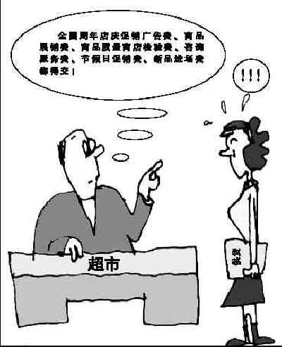 某商貿(mào)公司是一家經(jīng)營了20多年的企業(yè),與天津市所有超市都有業(yè)務(wù)往來。該企業(yè)主管讓我們翻閱了部分賬目和合同文本后說:“你們看看這些資料就明白了,亂收費(fèi)的超市起初只有家樂福一家,現(xiàn)在幾乎所有超市都在效仿,收費(fèi)名目越來越多,真讓人難以承受。” 我們隨手翻閱了該公司去年和家樂福簽訂的一份合同,其中有如下收費(fèi)條目:無條件折扣費(fèi)、有條件折扣費(fèi)、DM廣告費(fèi)、咨詢服務(wù)費(fèi)、共同商品服務(wù)費(fèi)、節(jié)假日促銷費(fèi)、新品進(jìn)場費(fèi)、免費(fèi)樣品、新店開業(yè)促銷費(fèi)等。在與天津樂購超市簽訂的合同中,除上述條款外,還有全國周年店慶促銷廣告費(fèi)、商品展銷費(fèi)、商品質(zhì)量商店檢驗(yàn)費(fèi)等。該公司業(yè)務(wù)主管說:“這些是寫在合同上的,沒寫的收費(fèi)名目還很多,比如貢獻(xiàn)費(fèi)、價(jià)外支持費(fèi)、重裝贊助費(fèi)等!蔽覀儐枺骸斑@些收費(fèi)合理嗎?”財(cái)務(wù)人員氣憤地說:“哪兒合理呀!他們收哪項(xiàng)費(fèi)用都不敢給我們開發(fā)票,要么給虛假的購貨發(fā)票,要么讓用貨物抵扣,不僅收了錢還逃了稅! 我們找有代表性的部分產(chǎn)品供貨廠商座談,大家都叫苦不迭。一個(gè)大型商貿(mào)企業(yè)的負(fù)責(zé)人說:“超市這些年做事越來越過分。沃爾瑪剛進(jìn)中國時(shí),幾乎不收什么費(fèi)用,后來從家樂福跳槽過來一個(gè)高管,把沃爾瑪也帶壞了,居然做出了讓我們補(bǔ)交往年費(fèi)用的荒唐事。我們不給錢,就直接從貨款里扣,真是太霸道了!”
