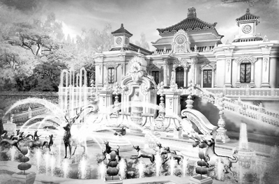 | 橫店圓明新園效果圖(西洋樓—大水法) | 公元1860年,大火在焚燒了整整3天后,享有“萬園之園”美譽的清代皇家園林——圓明園,被燒得面目全非,只剩下了殘垣斷壁。 此后的百余年間,是否要重建圓明園的爭論卻一直沒有停止過。無論是主張修復(fù)的“主修派”,還是主張維持原狀的“保留派”,都舉步維艱。無可否認的是,這片廢墟承載了太多的沉重記憶,列強侵略中國的歷史在這里鐫刻。 2006年初,以經(jīng)營影視基地而聞名的浙江橫店集團宣布將籌建圓明新園。建筑界、學(xué)術(shù)界一片嘩然,眾多網(wǎng)民也紛紛發(fā)表自己的觀點。2008年2
