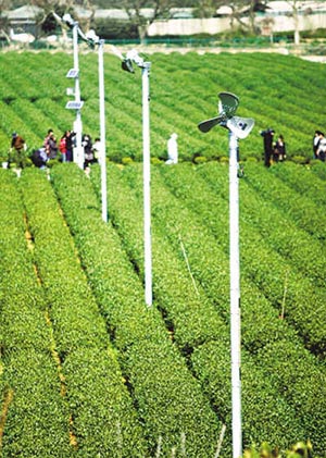 2月29日,浙江杭州梅家塢一塊龍井茶園里安裝了8臺風扇,當溫度低于4攝氏度時,風扇會自動開啟,利用加快冷暖空氣對流的方式來減少霜凍對茶葉的影響。
