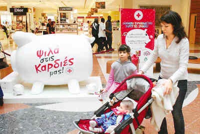 3月8日,人們走過(guò)塞浦路斯首都尼科西亞一個(gè)商場(chǎng)內(nèi)設(shè)立的超大豬形儲(chǔ)錢(qián)罐。當(dāng)日,當(dāng)?shù)乜駳g節(jié)進(jìn)入高潮,紅十字會(huì)借機(jī)推廣“零錢(qián)獻(xiàn)愛(ài)心”活動(dòng),呼吁民眾將家中零散的舊硬幣捐獻(xiàn)出來(lái)用于慈善事業(yè)。