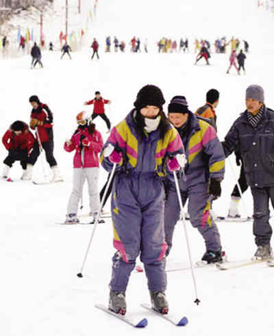| 正在學(xué)習(xí)滑雪的南方游客 | 當(dāng)滑雪從歐美傳入中國(guó)后,誰(shuí)也不曾想到,這項(xiàng)西方的“貴族運(yùn)動(dòng)”會(huì)在近幾年,在中國(guó)迅速走向大眾。幾年突飛猛進(jìn)地發(fā)展,使滑雪運(yùn)動(dòng)不再高高在上。在一些滑雪場(chǎng)可以看到,當(dāng)?shù)氐氐氐赖赖霓r(nóng)民擔(dān)當(dāng)著導(dǎo)滑員,操練著城里人,發(fā)燒友不再只是那些