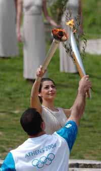 以奧運(yùn)回家為主題的第28屆雅典奧運(yùn)會(huì)火種 采集儀式在希臘奧林匹亞古奧林匹克體育場(chǎng)舉行。新華社記者:戚恒