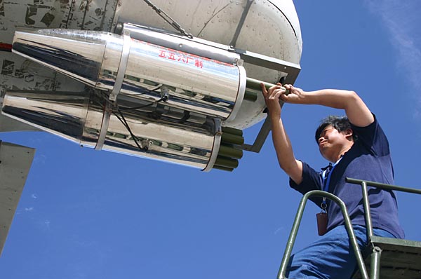 圖為2007年8月8日,工作人員為“運(yùn)8”飛機(jī)安裝催化材料。為保障2008年奧運(yùn)會(huì)開(kāi)、閉幕式順利舉行,北京、內(nèi)蒙古氣象部門于2007年8月8日至9日聯(lián)合在呼和浩特進(jìn)行2008年奧運(yùn)會(huì)“消云減雨”演練。(資料照片) |