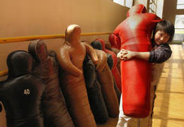 3月27日,一名國(guó)家武術(shù)散打隊(duì)女隊(duì)員扛著人形沙袋準(zhǔn)備上場(chǎng)地訓(xùn)練摔技。 經(jīng)國(guó)際奧委會(huì)同意,在北京奧運(yùn)會(huì)期間將同時(shí)舉行“北京2008武術(shù)比賽”。為做好備戰(zhàn)工作,國(guó)家武術(shù)運(yùn)動(dòng)管理中心在年初組建了國(guó)家武術(shù)散打隊(duì),16名男女選手都是獲得世界、全國(guó)冠軍的散打高手。目前,他們正在陜西省體育訓(xùn)練中心緊張訓(xùn)練,力爭(zhēng)在北京奧運(yùn)會(huì)期間,向世界各國(guó)人民展現(xiàn)中國(guó)武術(shù)的精華和魅力。 |