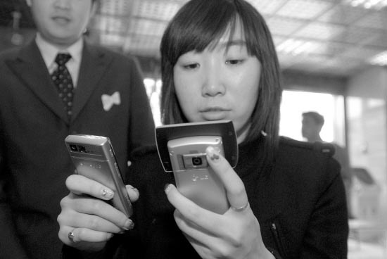 最終,邊蕊選擇了一款LG-KD876手機。邊蕊告訴記者,她最看中3G的可視通話功能,別看這次只買一部手機,但卻申請了兩個3G號碼,要是用好了,明天就讓男朋友也買一部,這樣即使身在外地也能看清對方的模樣。