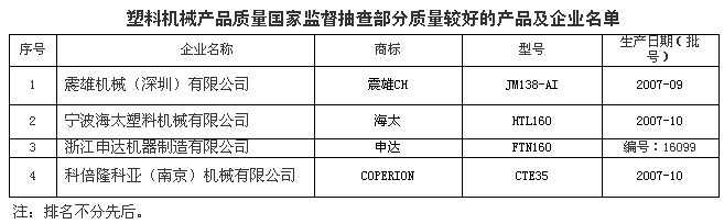 為維護(hù)消費(fèi)者的合法權(quán)益,促進(jìn)塑料機(jī)械行業(yè)健康發(fā)展,國(guó)家質(zhì)檢總局組織對(duì)塑料機(jī)械產(chǎn)品質(zhì)量進(jìn)行了國(guó)家監(jiān)督抽查。共抽查了上海、浙江、江蘇、廣東、福建、山東等6個(gè)省、直轄市30家企業(yè)生產(chǎn)的30種產(chǎn)品(不涉及出口產(chǎn)品),產(chǎn)品實(shí)物質(zhì)量抽樣合格率為90%。