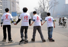 山西省太原理工大學(xué)輪滑協(xié)會的20多名隊員穿上旱冰鞋和自制的文化衫開展奧運宣傳活動,表達對北京奧運會的祝福。