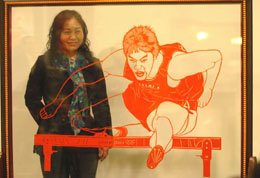 “中國人的驕傲”剪紙藝術(shù)巡展首站在香港中央圖書館啟動,展出近200幅以奧運為主題的剪紙作品。圖為“中國人的驕傲——永恒瞬間”創(chuàng)作人盧雪和她的作品《劉翔》合影。 |