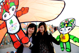 兩位姑娘在漢中市橋北廣場選購制作精美的福娃風(fēng)箏。