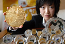 本報(bào)訊 由北京奧組委授權(quán)、中國(guó)印鈔造幣總公司發(fā)行的北京2008年奧運(yùn)會(huì)火炬接力紀(jì)念章將于近期上市發(fā)售。該紀(jì)念章共有5種規(guī)格,所有產(chǎn)品均分別采用999純金和999純銀鑄造而成,限量發(fā)售。據(jù)介紹,此款紀(jì)念章的正面為每個(gè)火炬?zhèn)鬟f城市的彩印形象,這在奧運(yùn)藏品領(lǐng)域尚屬首次。