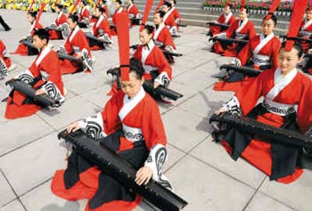 4月9日,首屆中國鄭州炎黃文化周在鄭州黃河風(fēng)景名勝區(qū)炎黃廣場開幕。此活動(dòng)以“萬龍歸宗、祈福中華”為主題,弘揚(yáng)中華優(yōu)秀傳統(tǒng)文化。圖為演員在開幕儀式上彈奏古琴。
